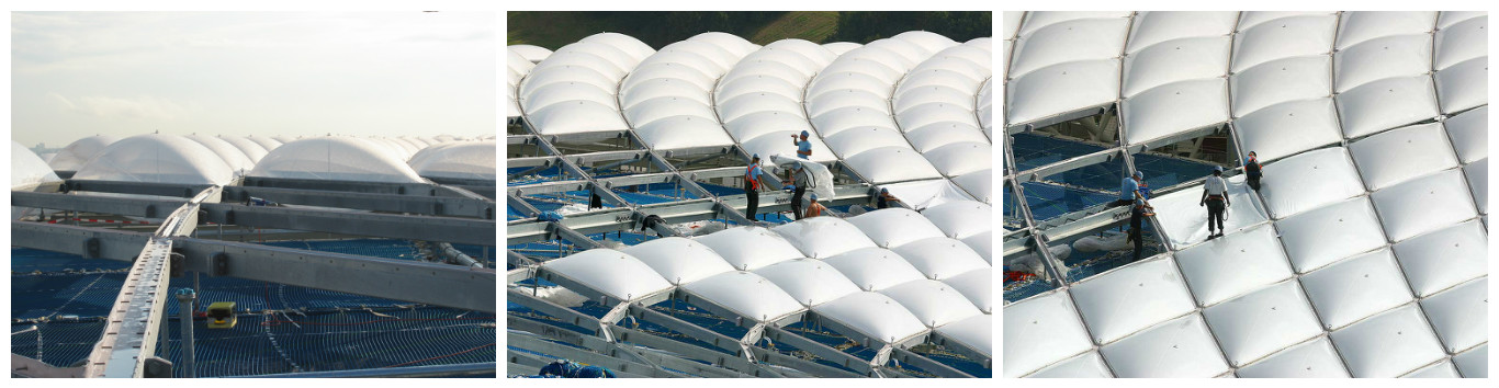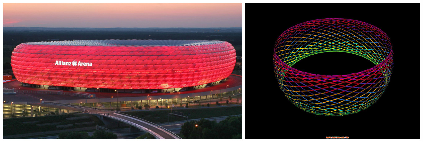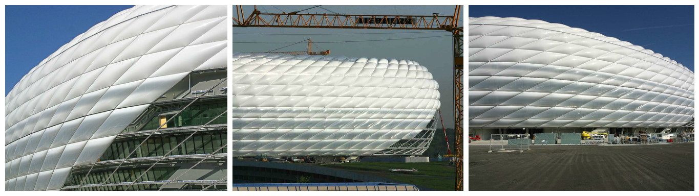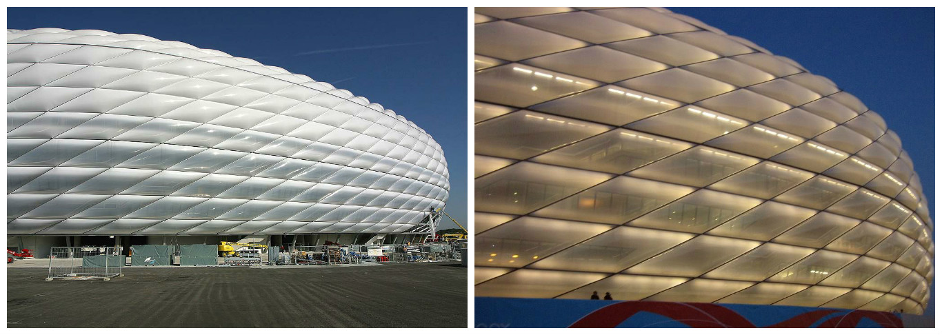 它不同尋常的表面由2874個菱形膜結構構成,膜結構具有自清潔,防火、防水以及隔熱性能,里邊永遠保持350帕斯卡的大氣壓。每個膜結構都可以在夜間被照成紅藍白三色,分別對應于拜仁、1860以及德國國家隊的隊服顏色。